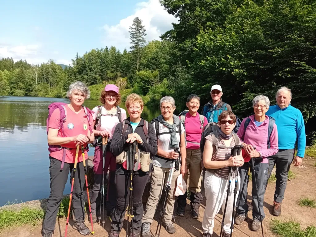 Ce dimanche, nous sommes 9 marcheurs à prendre le départ au niveau de l’Etang des Fées à Saulxures, malgré une météo très mitigée… Nous nous dirigeons vers le Haut du Comte où nous pouvons tout de même apprécier la vue qui s’offre à nous à ce moment-là sur Thiéfosse et Cornimont. Puis, nous enchaînons la montée par la Tête de Zéfeut, le col de Lauvy et nous nous dirigeons vers le col de la Croix des Moinats. Entre-temps, nous avons croisé des cyclistes de la rando VTT de Saulxures, que nous avons encouragés vu l’alternance de soleil, de pluie et de vent et l’état des chemins !! Quand nous arrivons au col des Hayes, il est midi et nous profitons de l’abri du feu de St jean pour manger au sec et c’est là que le soleil se décide enfin à rester avec nous.